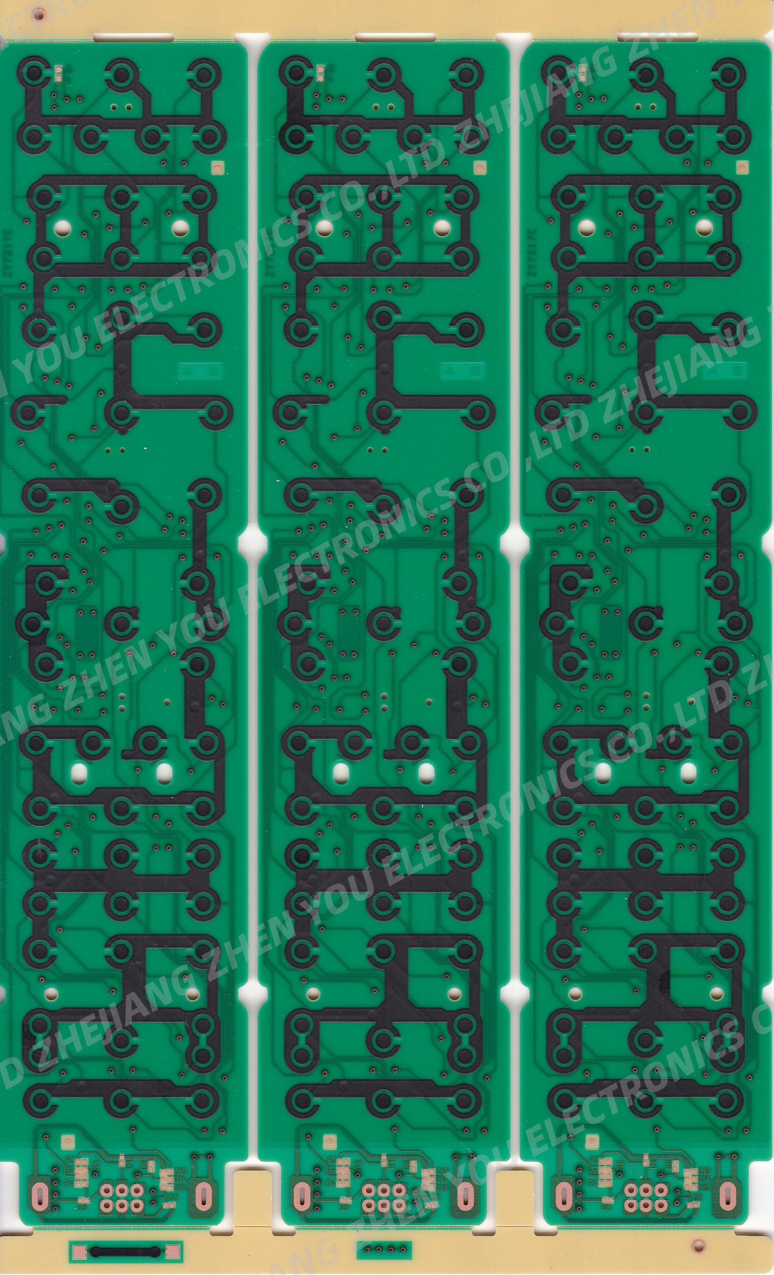 此产品为铜浆灌孔板,使用铜浆灌入孔中从而达到和镀通孔双面板一样的效果,并且线路板表面使用了碳膜以及OSP的工艺来加强抗氧化性。