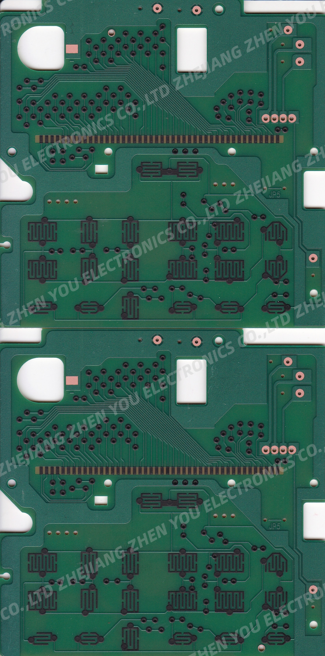 此产品为碳浆灌孔板,使用碳浆灌入孔中从而达到和镀通孔双面板一样的效果,并且线路板表面使用了碳膜以及OSP的工艺来加强防氧化性。
