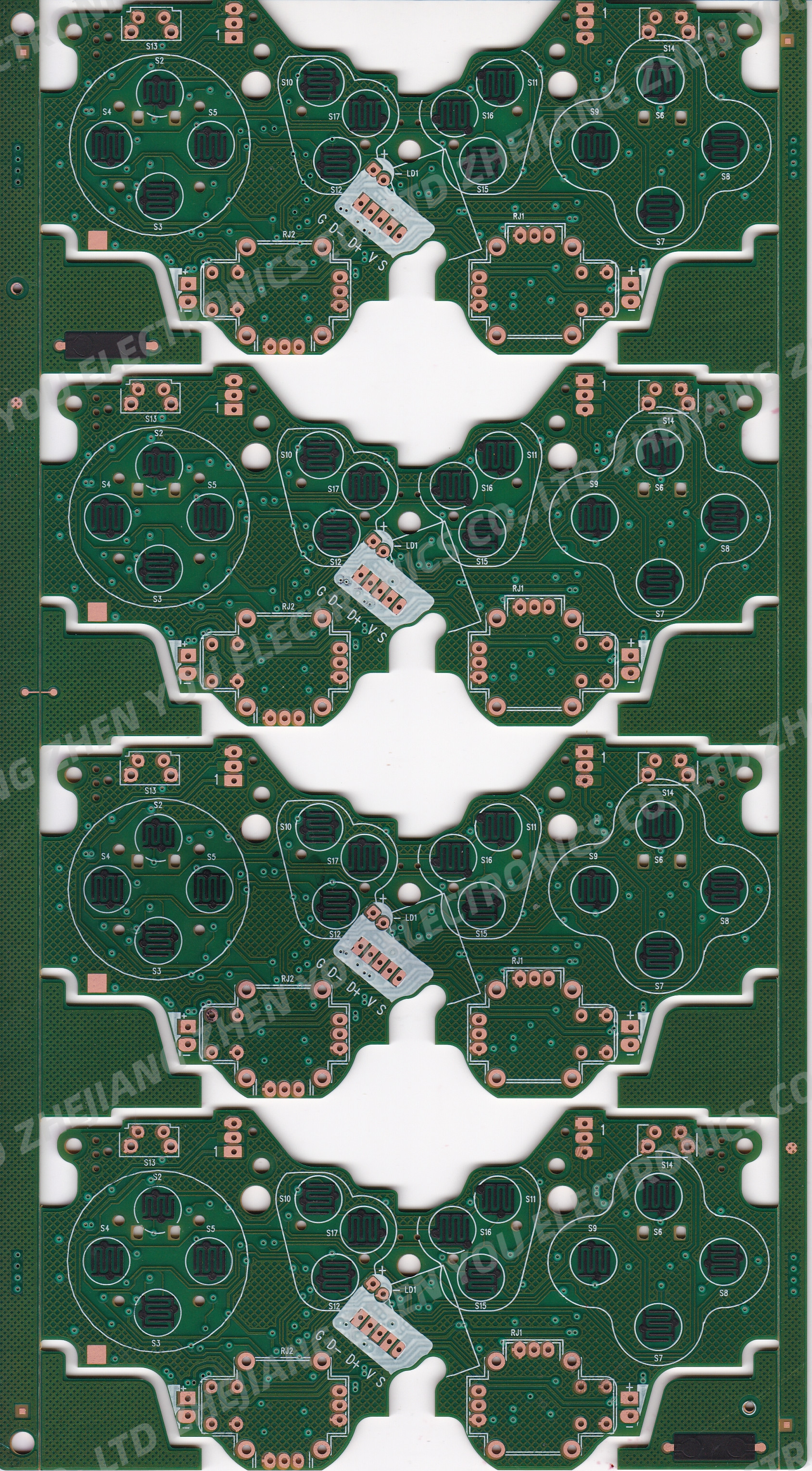 此产品为银浆灌孔板,使用银浆灌入孔中从而达到和镀通孔双面板一样的效果,并且线路板表面使用了碳膜以及OSP的工艺来加强抗氧化性。